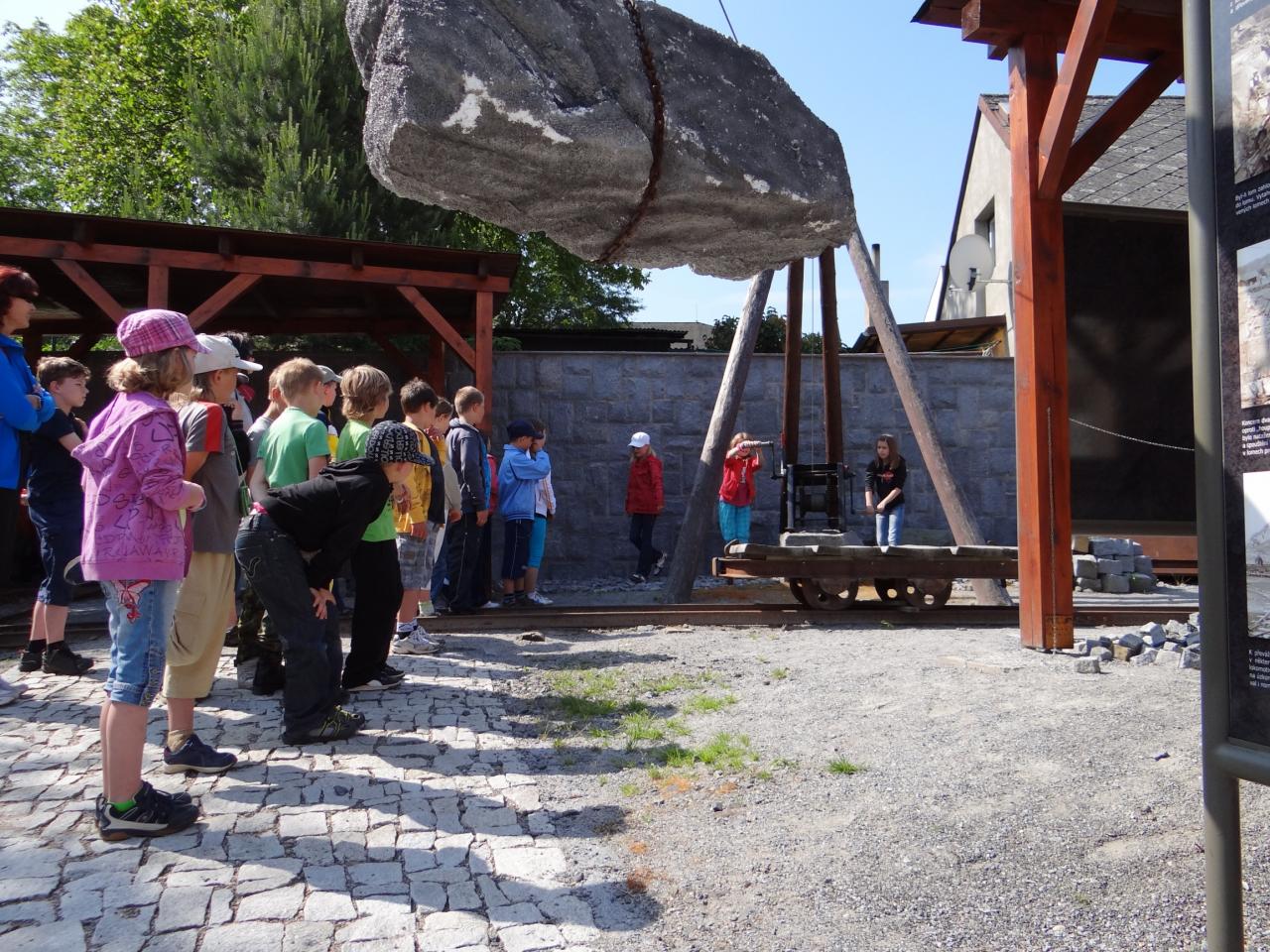 Venkovní kamenická expozice jim převypráví příběh vzniku dlažební kostky. Obyčejné věci, které si mnoho nevšímáme, a přece je pro nás tak důležitá. Žáci si budou moci vyzkoušet manipulaci s řadou funkčních exponátů, např. s jeřábem, svážnou, lanovkou či ruční třídičkou štěrku. Přímo při práci pak uvidí kameníka, který bude za pomoci dlabačky lámat žulové plátky a u beranové štípačky je dělit na dlažební kostky.